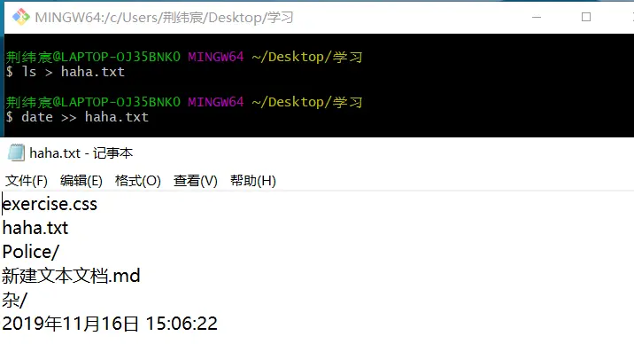 命令创建了haha.txt,并且把ls输入 进去。