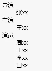 <dl> <dt>导演</dt> <dd>张xx</dd> <dt>主演</dt> <dd>王xx</dd> <dt>演员</dt> <dd>周xx</dd> <dd>王xx</dd> <dd>李xx</dd> <dd>白xx</dd> </dl>