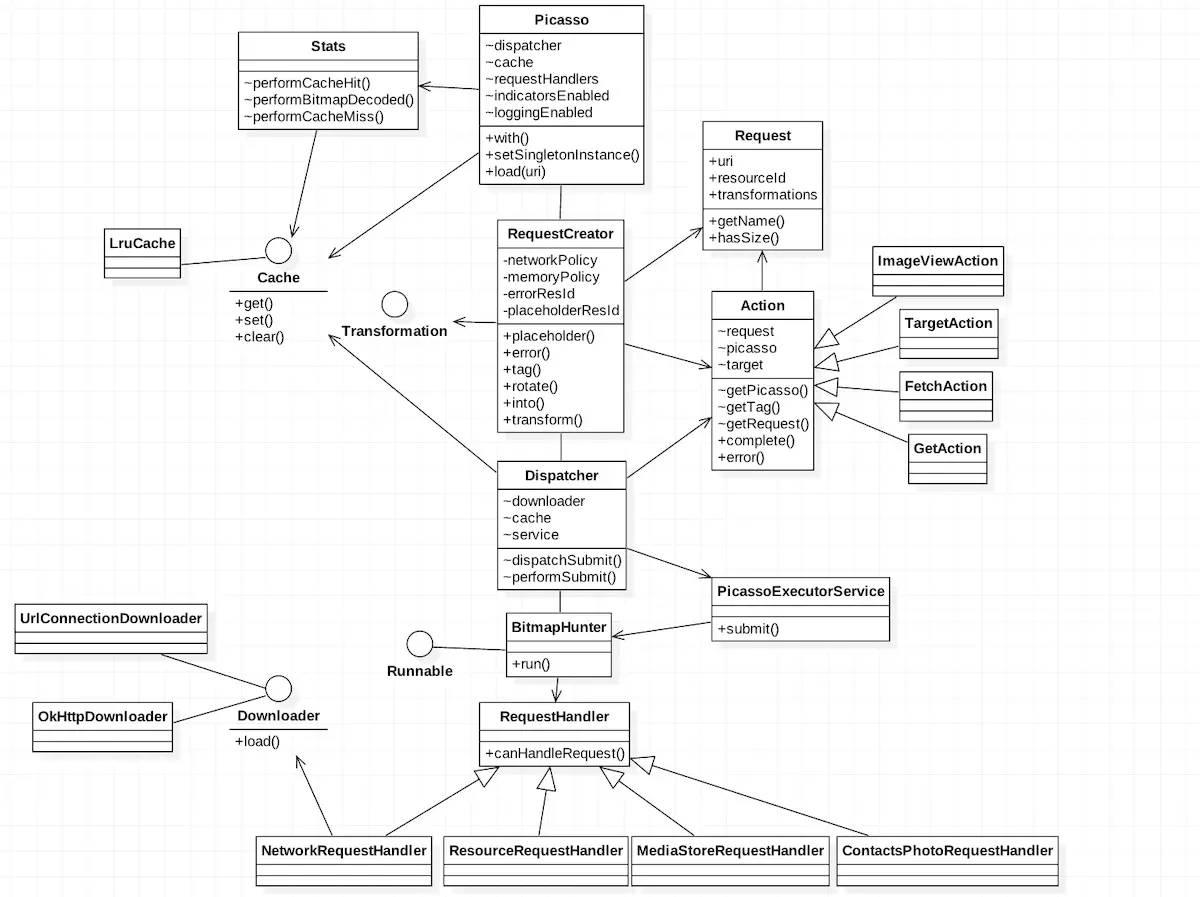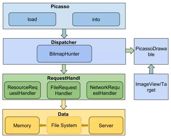 Picasso:负责图片下载、变换、缓存的管理器,当它收到一个图片下载请求的时候,它会创建Request并提交给Dispatcher