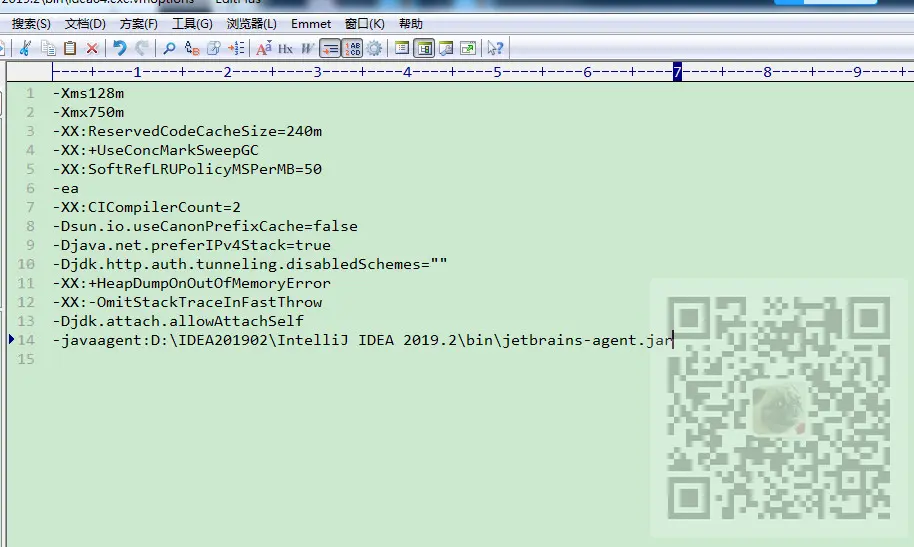 并在此目录下打开idea64.exe.vmoptions文件,在末尾中添加如下路径,对应刚才的jar包所在的路径