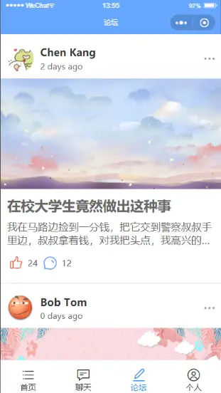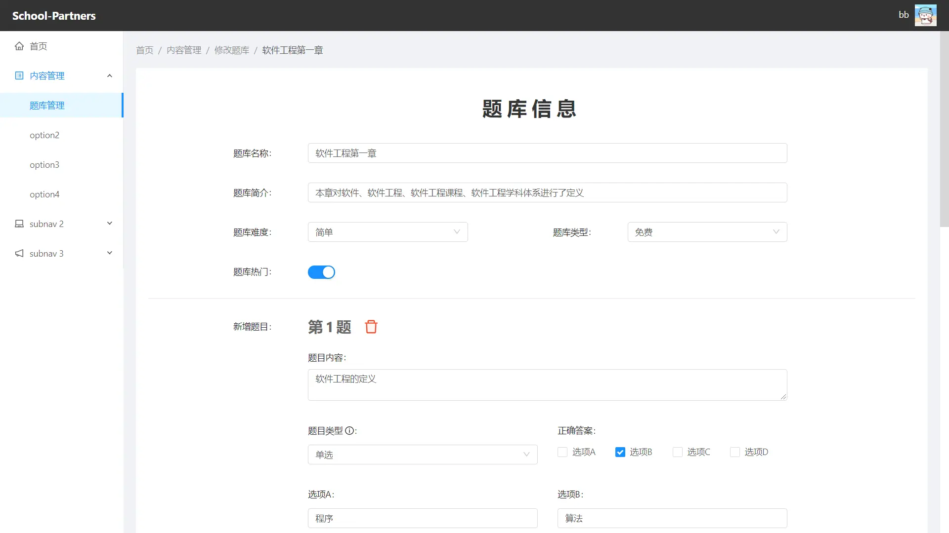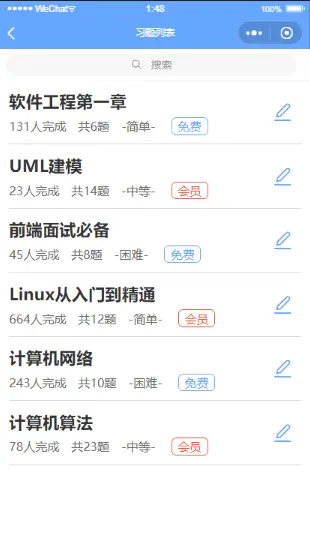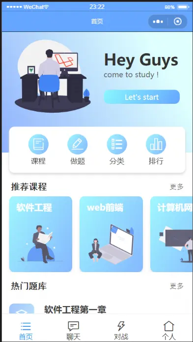 目前因学业任务比较重,没有好好的完善,目前小程序端比较完善的只有习题,课程,论坛,聊天室。管理端也开始进行开发了,现在完成了题库管理,新增题库,修改题库以及登录的功能