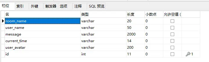首先我们的后端数据库采用的是mysql,我们建了一个聊天记录的表(萌新勿喷~)