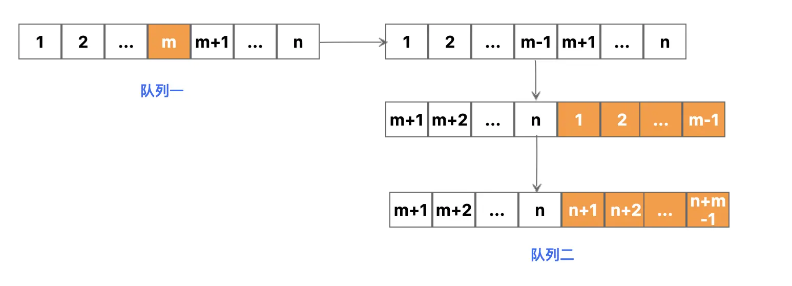 以上就是队列长度为n,第一次报数为m的用户出列后将n-1的其他人转换到n-1的子队列的过程。