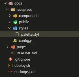 - vuepress项目的文档结构,都必须按照官方文档的格式进行制作。比如说你想修改整体的主题颜色,你就必须修改styles文件夹下的palette.styl。你想在markdown中添加vue组件,vue组件必须放在components文件夹下,诸如此类。等到vuepress在打包的时候,它会遍历特定的路径和文件名称,读取内容生成页面结构和样式。