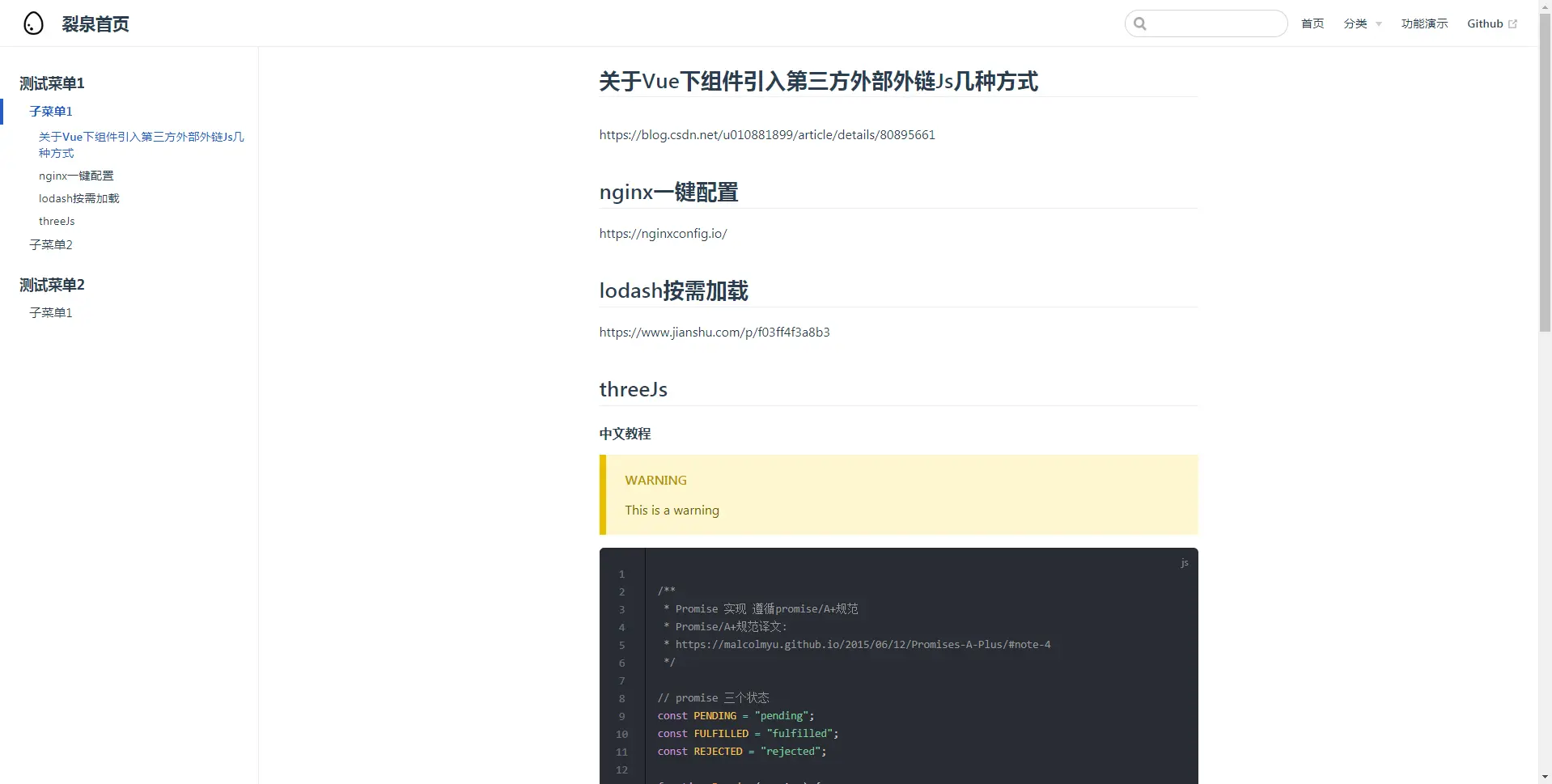 当我们的markdown文件创建好之后,我们导航栏和侧边栏的跳转链接也就有了对应的文件。我们再点击进顶端导航栏的分类-文章,即可跳转至如下页面: