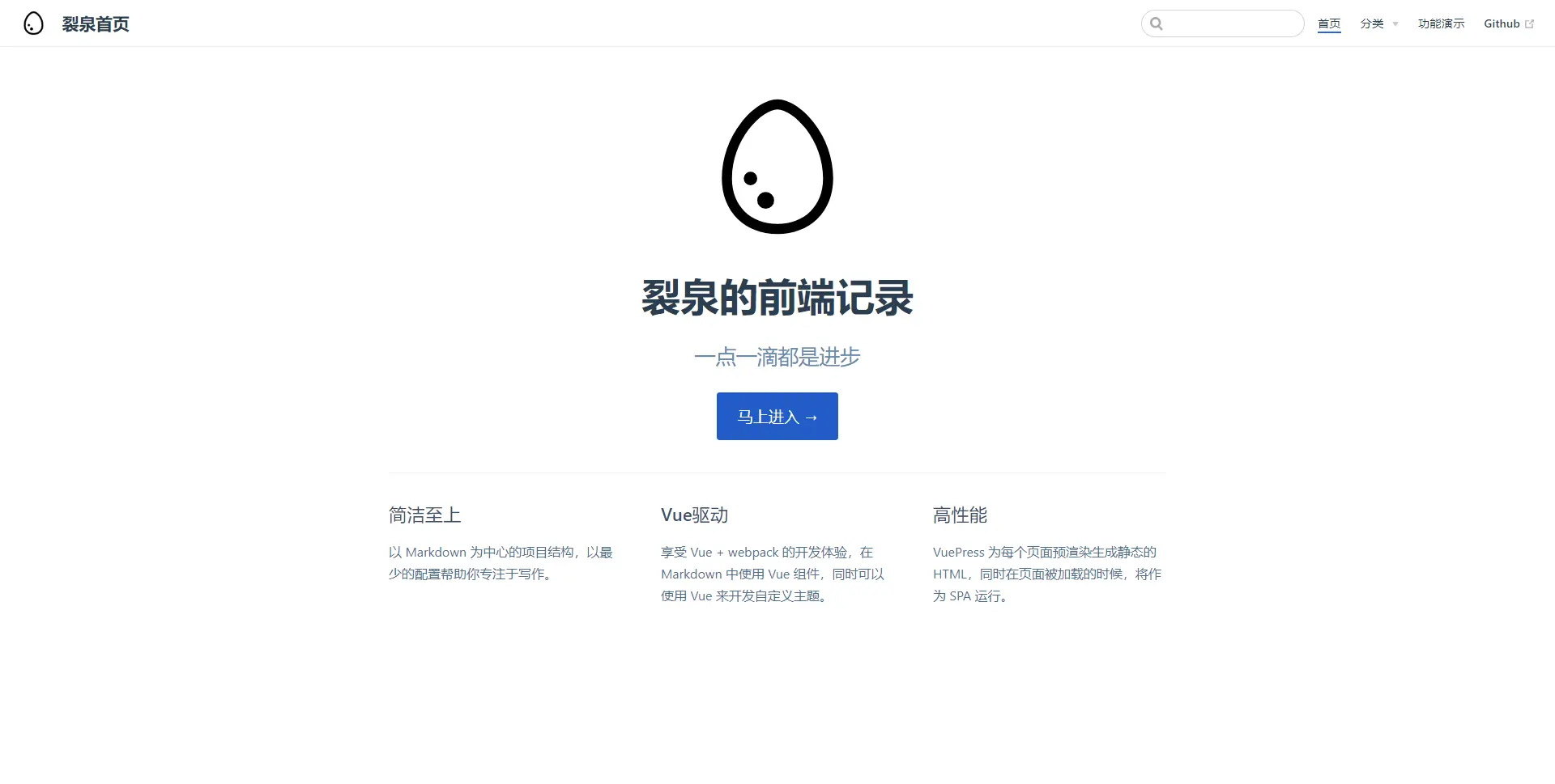 details: 享受 Vue + webpack 的开发体验,在 Markdown 中使用 Vue 组件,同时可以使用 Vue 来开发自定义主题。