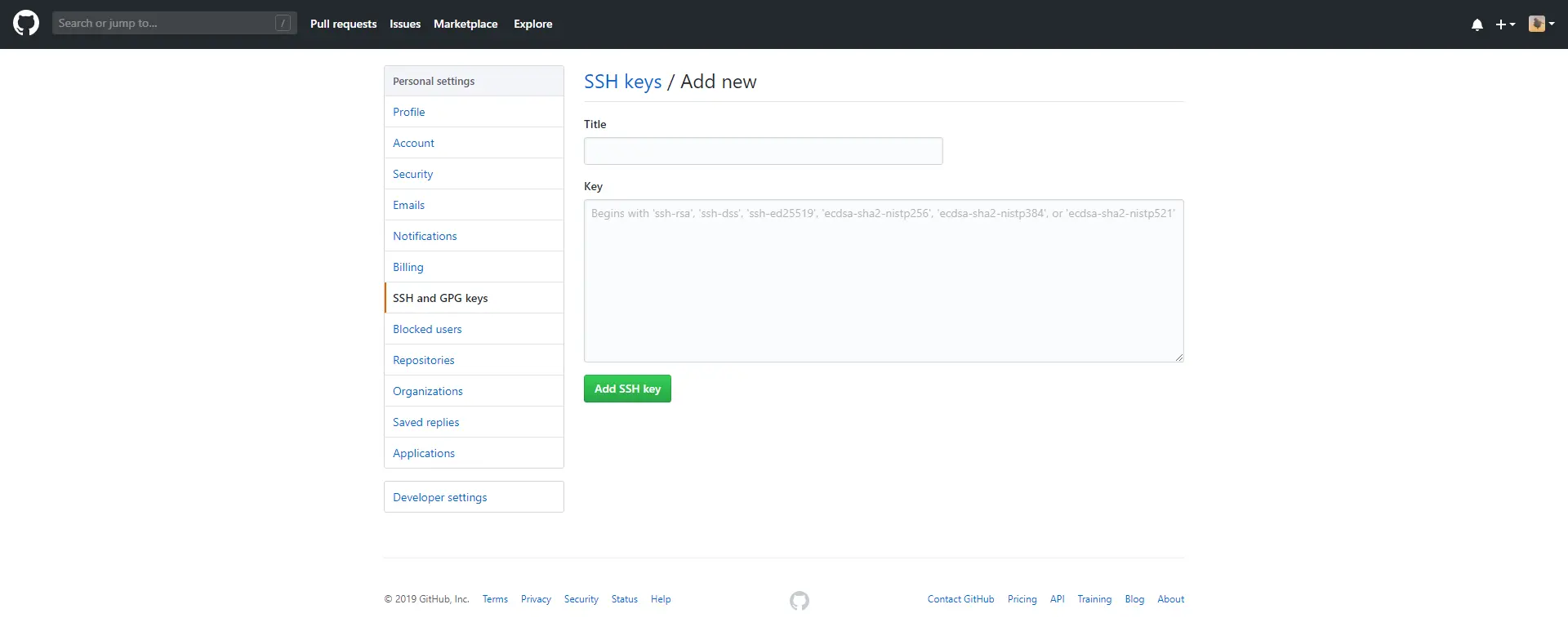 第四步,打开我们的github页面,点击右上角的头像,点击下拉菜单的setting,跳转页面后点击侧边栏的SSH and GPG keys,点击New SHH key进入我们如下界面