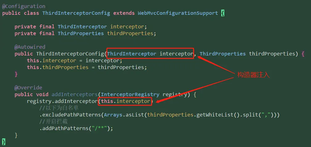 拦截器不加任何自动配置注解,防止Spring自动装配和初始化,并通过构造器显示声明依赖