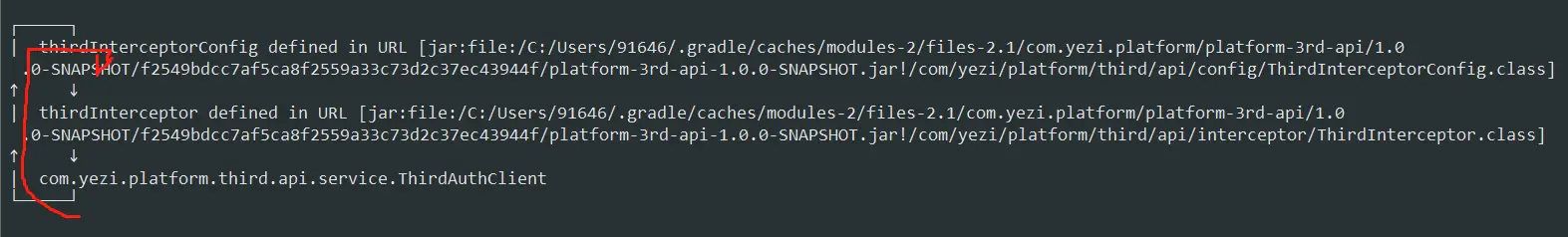 看报错,前两个依赖能理解,但是ThirdAuthClient依赖ThirdInterceptorConfig无法理解,这只是一个@FeignClient,应该是在spring启动之后加载。看类图关系也看不出结果,初步怀疑是跟spring bean加载顺序有关系,虽然看到的是循环依赖,但实际可能是用错了加载方式。