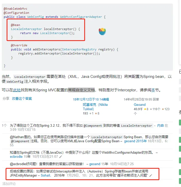 循环引用报错应该是Spring在递归解析的时候检测出来的,并且跟我写的构造器方式初始化bean有关系。在网上看到的拦截器的注入方式基本都是手动创建的。