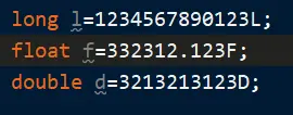 L 或小写 l 皆可(不推荐使用 l,因为容易与阿拉伯数值 1 混淆)。大写 F 或小写 f 表示 float 浮点数。大写 D 或小写 d 表示 double 双精度。