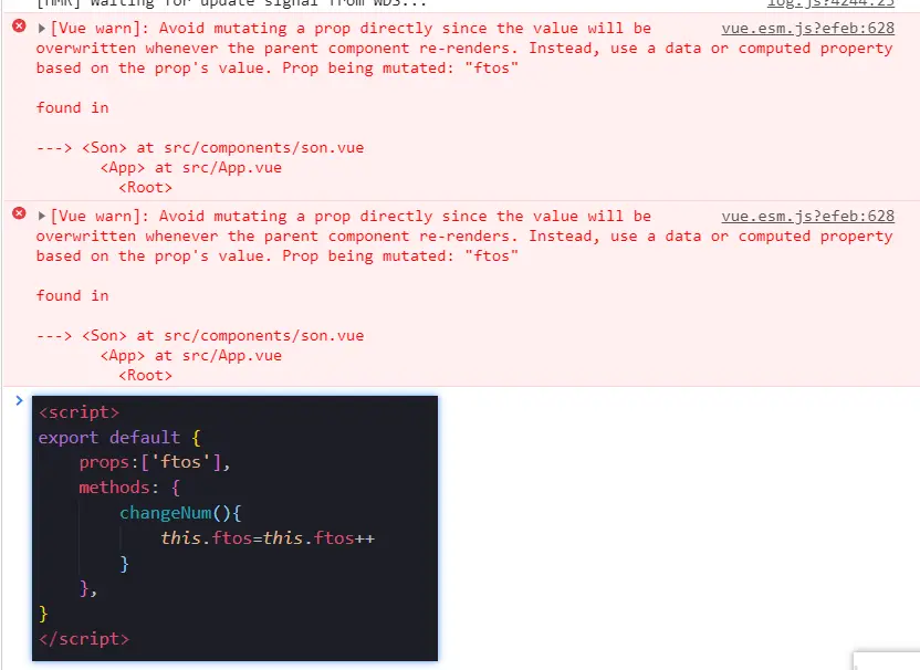 一个bug,不能在子组件对num的值进行修改,它只有权利使用,没有权利修改.因为vue有一个很重要的特性,叫做单向数据流特性