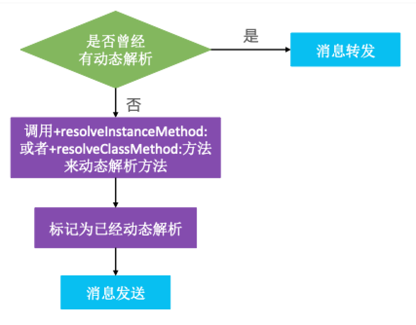 + (BOOL) resolveInstanceMethod:(SEL)sel或+ (BOOL)resolveClassMethod:(SEL)sel来进行动态方法解析; - 动态方法解析如果有实现:会有一个