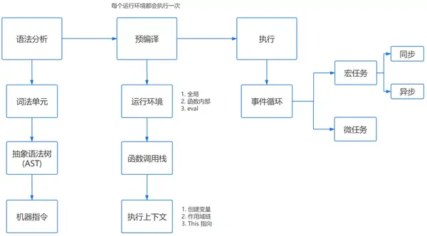 JS 脚本加载完毕后,会首先进入语法分析阶段,它首先会分析代码块的语法是否正确,不正确则抛出“语法错误”,停止执行。