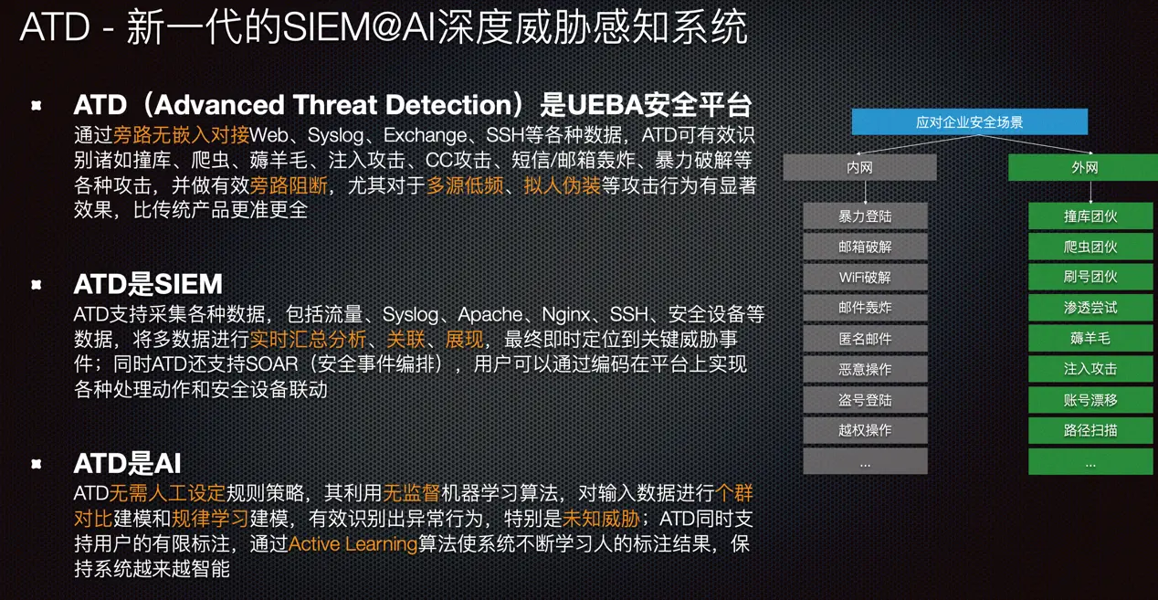 为适应市场需求,ATD不断进行更新迭代。其UEBA(用户行为分析),使平台完全摆脱由于人工配置而导致的安全威胁遗漏、系统定制成本高、可维护性差等问题。在人工智能技术的基础上,ATD还集成了SOAR(安全编排自动化响应)平台,帮助企业实现多种威胁处理逻辑。