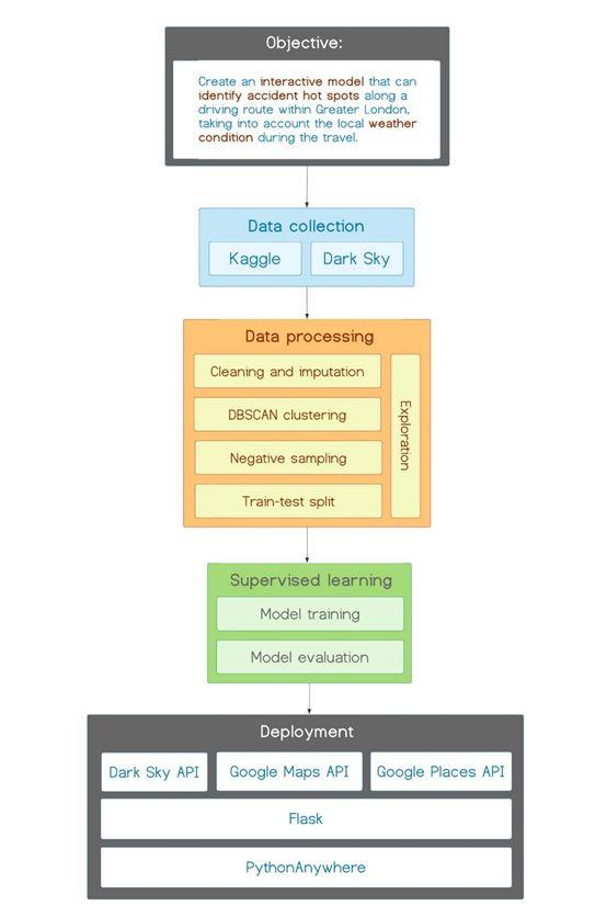 在正式着手项目之前,笔者团队设定了一个明确的目标:创建一个便于大众使用的交互式交通事故预测器。实现这一目标的最佳方式就是部署已训练的预测器至网站,并且该预测器网站将能够完成以下任务: