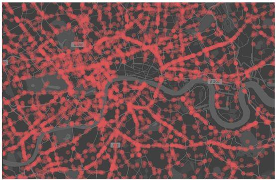 上图是一幅伦敦城区地图,图中每一个红点表示2012年至2014年间发生的某起交通事故。显而易见,伦敦的交通事故极其频繁(至少以前是这样的)。