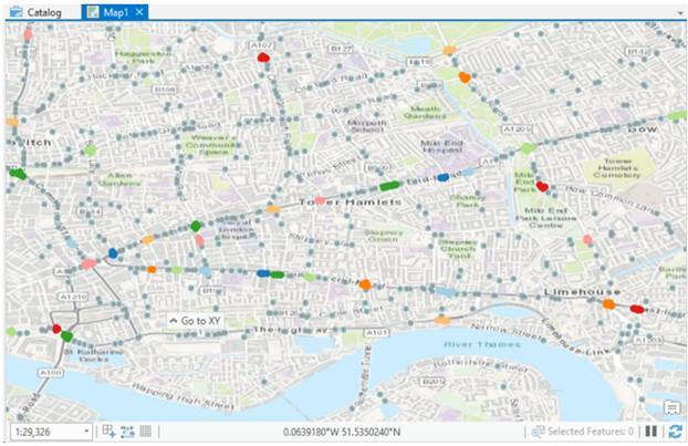 最后,DBSCAN聚类算法能够成功识别出473处事故频发路段。以下这幅图通过应用地理分析软件ArcGIS,对所有的热点路段进行了可视化处理。从图中可以看出,事故频发路段主要集中于伦敦各大主干道,比如A11和A13。