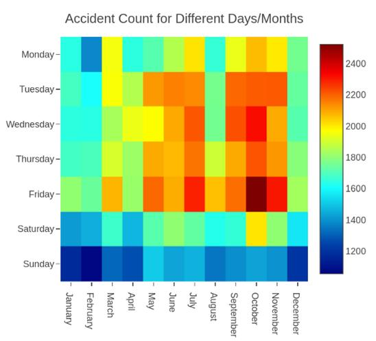 通过以上这幅热图,可以了解到一年中每个月份以及一周中每天发生交通事故的次数。仔细观察后会发现,九月至十二月交通事故发生频率较高。因为在这段时间伦敦是秋天,气温较低,多雾多雨。但是出乎预料的是,在一二月这种寒冷的冬季月份中,交通事故反而很少发生,可能是因为那时人们也不太愿意驾车外出。