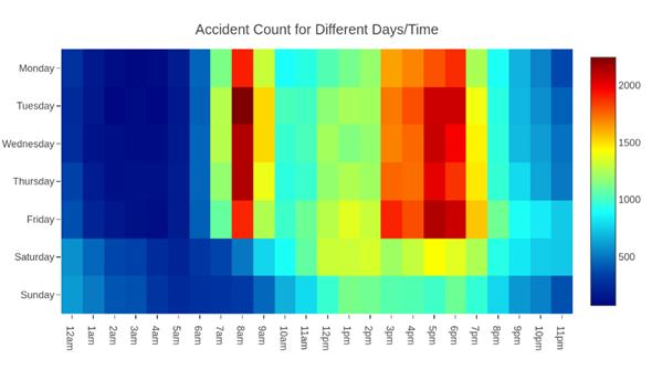 这幅热图显示的是一周中每天以及一天中每个时间段交通事故发生的次数。不出意外,大部分的交通事故都发生在交通高峰期,即八点到九点的早高峰和三点到七点晚高峰(图中紫色区域)。并且相比之下,周五的情况尤其糟糕。