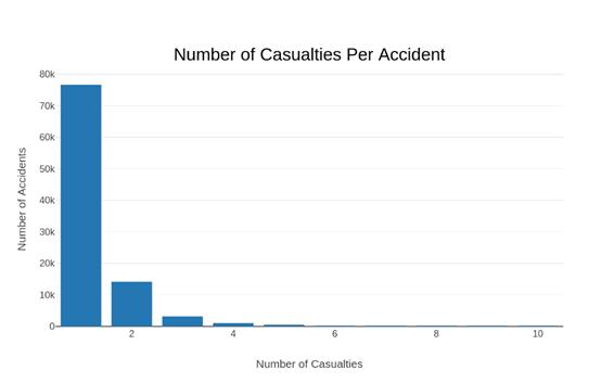 以上柱状图展示了每次交通事故所涉及的车辆数量。仔细观察后会发现,大部分交通事故涉及一至两辆车。这也符合大众常识,因为大部分交通事故都是一辆车突然偏轨,或者两辆车相撞。