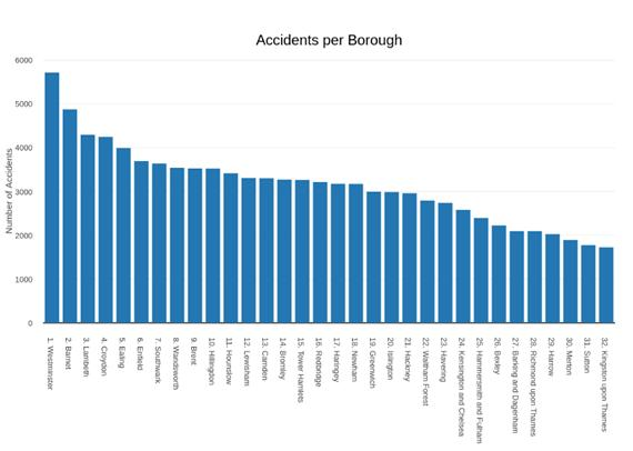 以上柱状图显示了发生于伦敦不同行政区内交通事故的数量。仔细观察后会发现,Westminster发生交通事故最频繁,事故发生频率最低的则是KingstonUpon Thames。下图以一种不同的方式呈现了同样的信息:它用深紫色标记事故频发区。