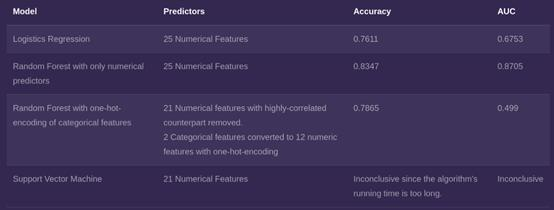 通过应用Python的scikit-learn库,能够对模型进行训练和评估。笔者团队测试了许多常用的分类模型,比如SVM、逻辑回归,以及随机森林。接着,测量并比较了各个模型的具体表现,主要是依据其准确率和ROC曲线下的面积。下表总结了建模结果。
