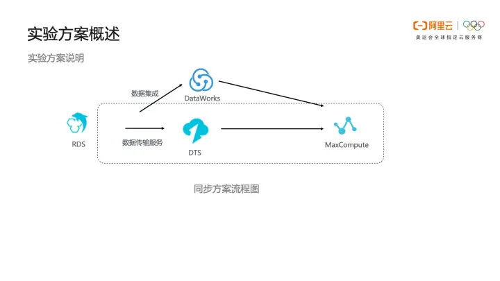 下图是同步的方案流程图,数据来源是RDS,包括两个数据同步链路,分别是DataWorks和DTS,数据最终要同步到MaxCompute中。