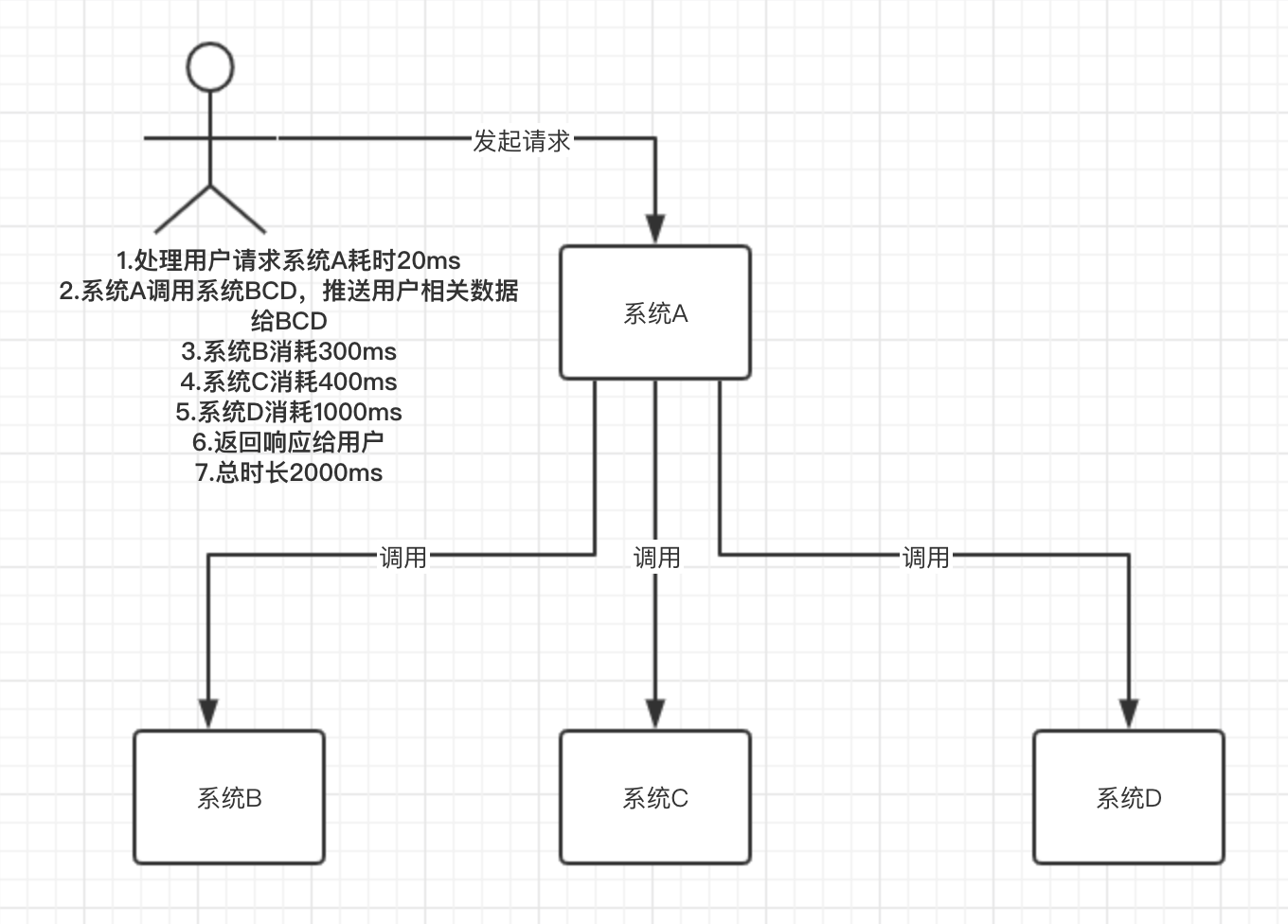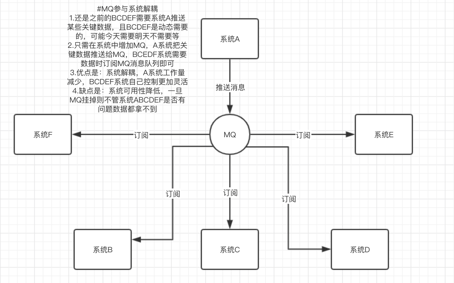 - 系统可用性降低,如果系统A给MQ发送消息时MQ故障,无法接受到消息,则系统BCD无法处理请求