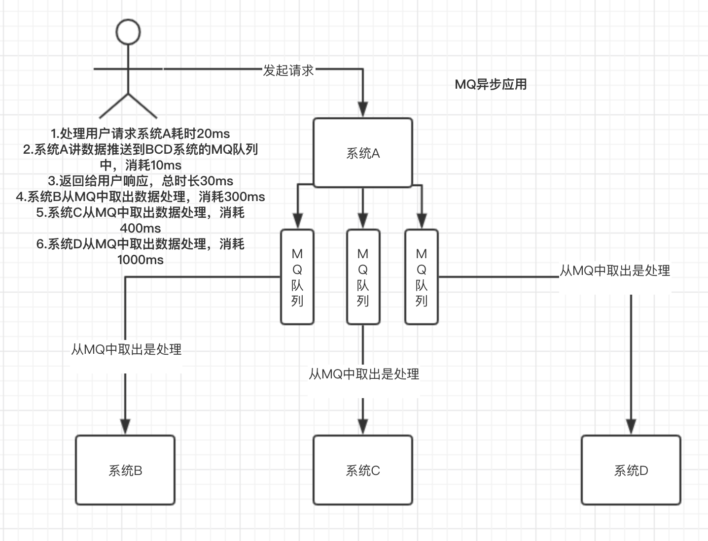 - 系统一致性问题复杂,系统A发送3条消息给MQ,但是其中MQ故障丢了1条消息,则系统BCD的数据会跟系统A对应不上