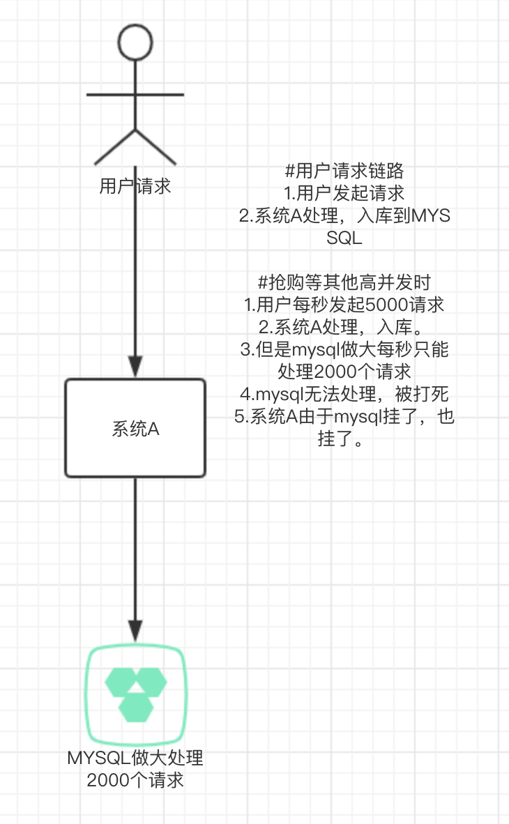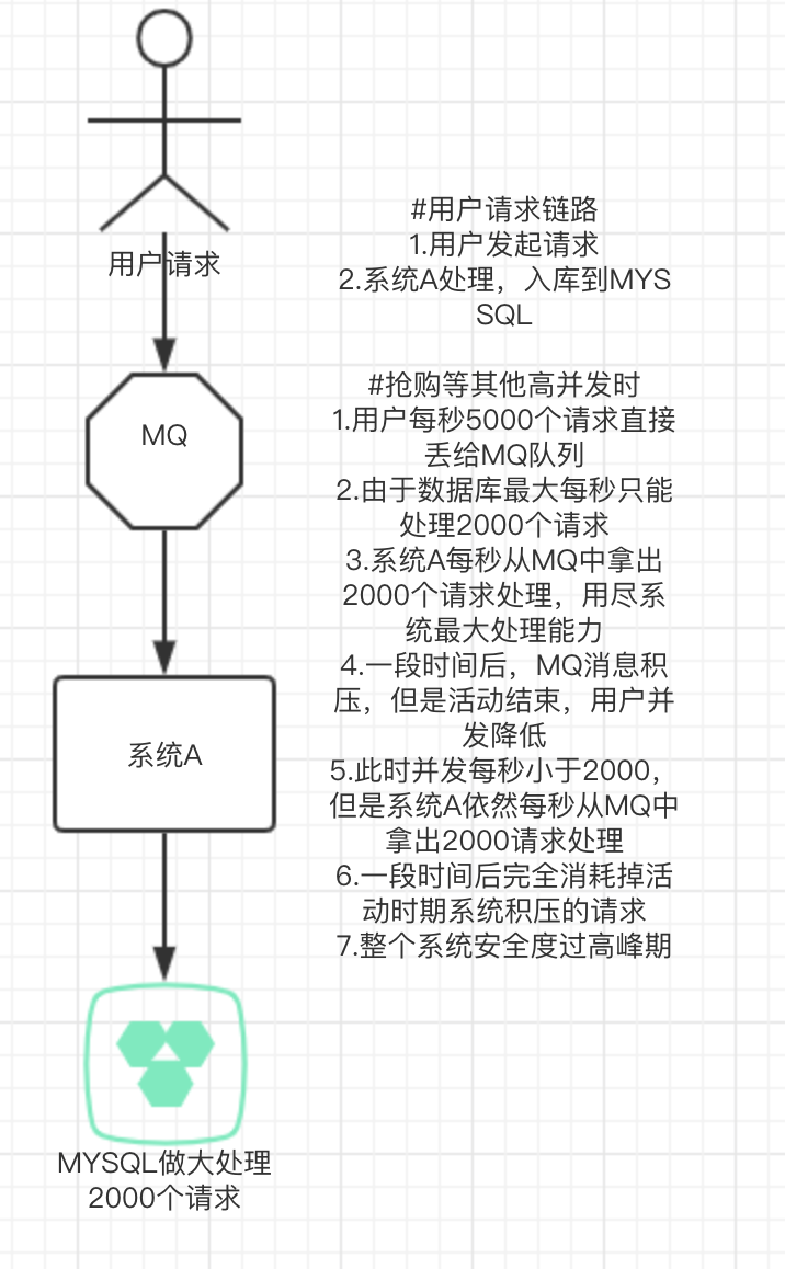 - MQ未参与系统,用户高并发请求时,消峰处理