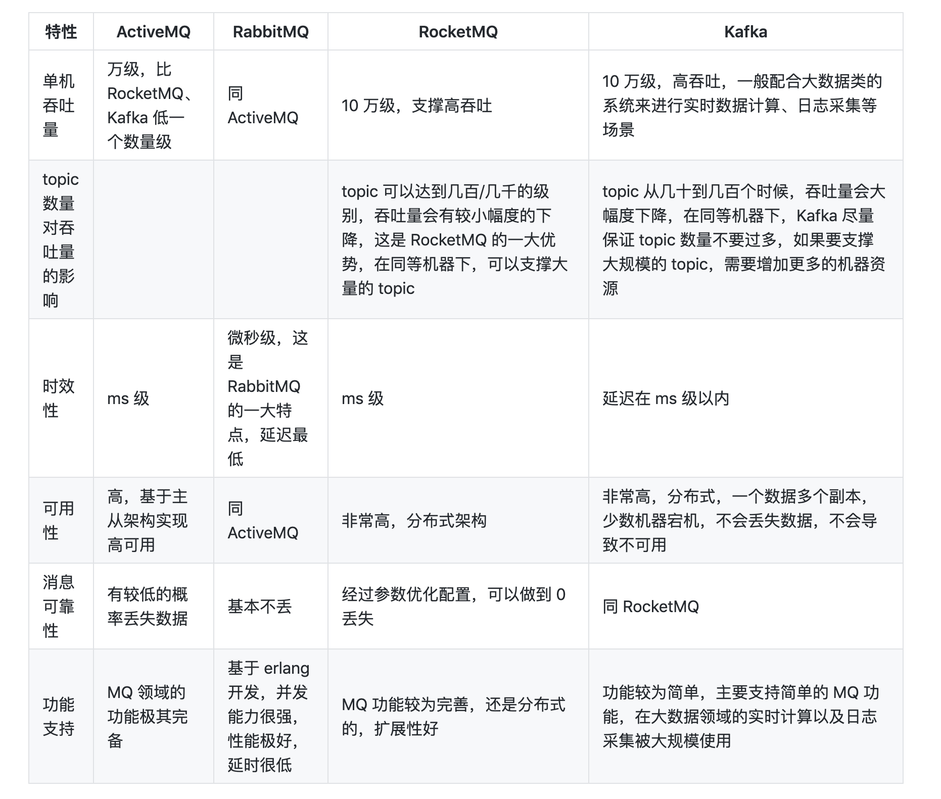 Kafka、ActiveMQ、RabbitMQ、RocketMQ 有什么优缺点?