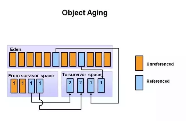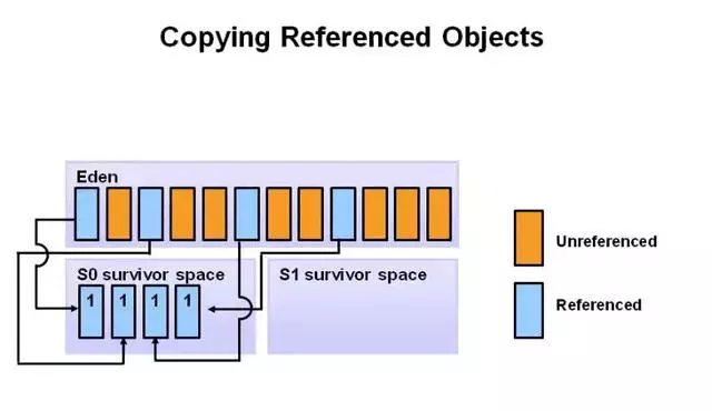 当 eden区满了,触发 minor garbage collections,这时还有被引用的对象,就会被分配到 S0区域,剩下没有被引用的对象就都会被清理。