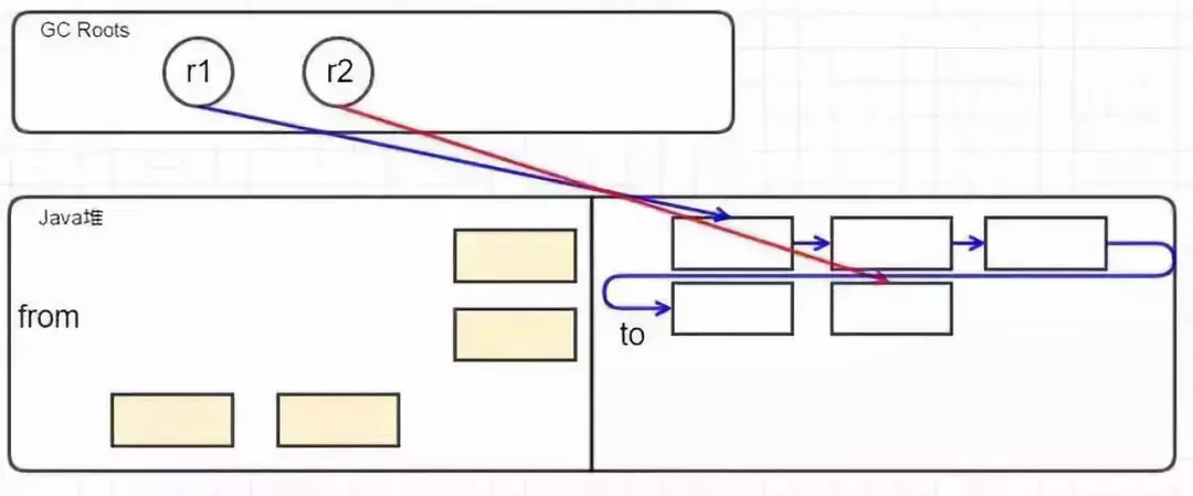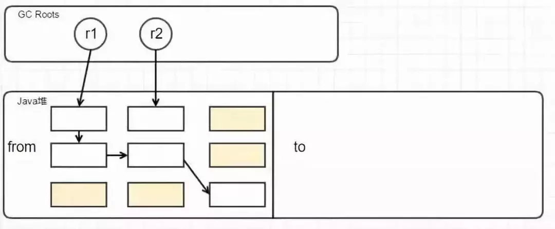 新生代管理内存采用的算法为 GC复制算法( CopyingGC),也叫标记-复制法,原理是把内存分为两个空间:一个 From空间,一个 To空间,对象一开始只在 From空间分配, To空间是空闲的。GC时把存活的对象从 From空间复制粘贴到 To空间,之后把 To空间变成新的 From空间,原来的 From空间变成 To空间。