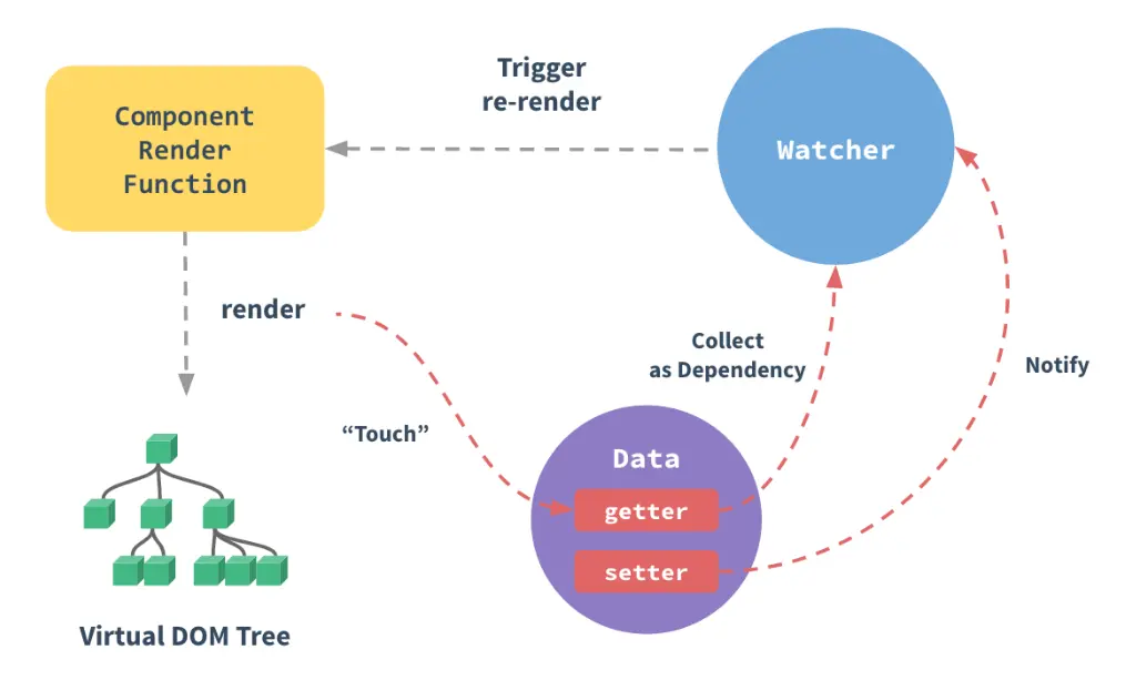 Vue 的响应式原理是核心是通过 ES5 的保护对象的 Object.defindeProperty 中的访问器属性中的 get 和 set 方法,data 中声明的属性都被添加了访问器属性,当读取 data 中的数据时自动调用 get 方法,当修改 data 中的数据时,自动调用 set 方法,检测到数据的变化,会通知观察者 Wacher,观察者 Wacher自动触发重新render 当前组件(子组件不会重新渲染),生成新的虚拟 DOM 树,Vue 框架会遍历并对比新虚拟 DOM 树和旧虚拟 DOM 树中每个节点的差别,并记录下来,最后,加载操作,将所有记录的不同点,局部修改到真实 DOM 树上。