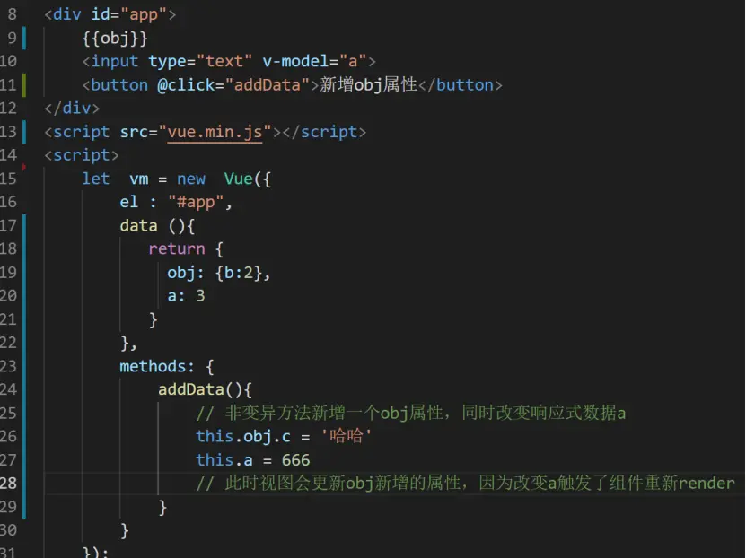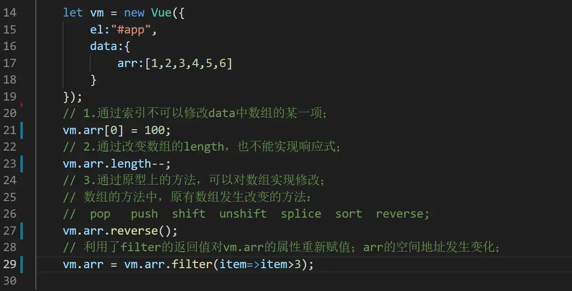 因为只要在 data 中声明的基本数据类型的数据,基本不存在数据不响应问题,所以重点介绍数组和对象在vue中的数据响应问题,vue可以检测对象属性的修改,但无法监听数组的所有变动及对象的新增和删除,只能使用数组变异方法及$set方法。