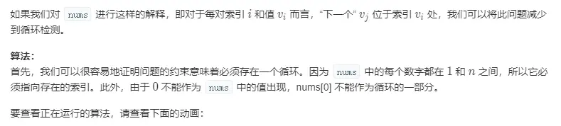 本算法关键就是重复数字会导致形成环,环解决就是通过快慢指针。然后该重复数组就是换的入口。