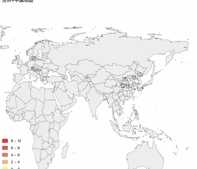 这次算第一次使用ECharts,看文档还是觉得挺头疼的,配置也太多了吧。。 看的眼花缭乱的。 散点地图里提供两种地图样式,一种是世界地图,一种是中国地图。其中世界地图如下图所示,是不展示中国省份的。但是我这个需求想要的结果是世界地图+中国详细省份。