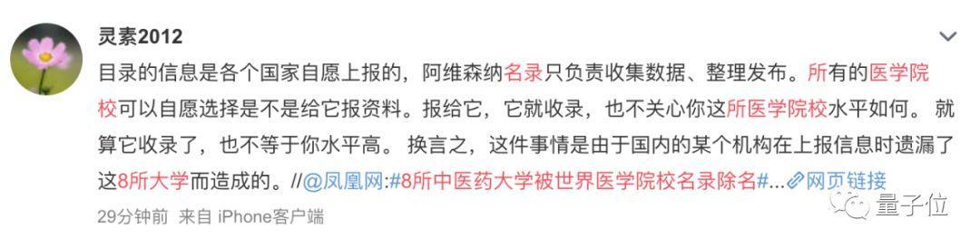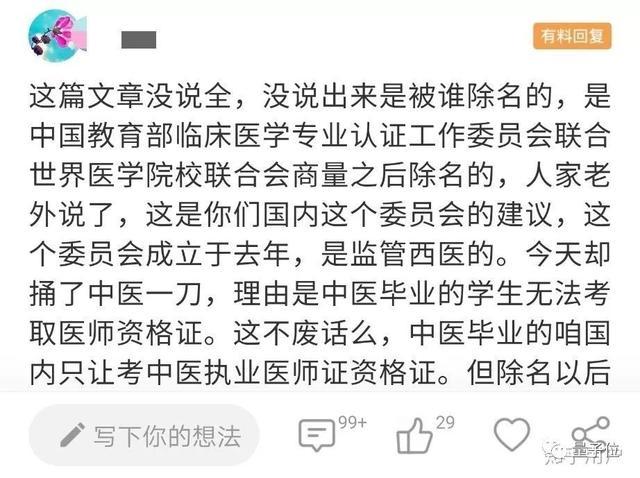 虽然没有任何官方回应和媒体报道,不过不少网友都把问题的源头指向了国内,表明是教育部临床医学专业认证工作委员会将中医药院校的认证专门划分给了另一个机构“中医药医学专业认证委员会”,这8所院校现在不归原来的委员会管,所以在报给《世界医学院校名录》的时候就没有这8所学校。
