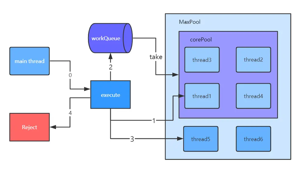 图上描述的是当处于业务高峰的时候, 此时阻塞队列是满的, 线程总量也达到最大线程数的阈值,