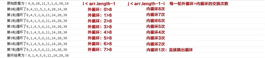 j < arr.length-1-i=======0 < 8(数组长度9-1-i(0))- 所以从上面我们得知: