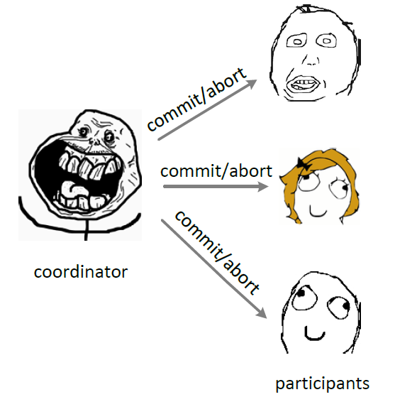 - 阶段1: coordinator或watchdog未收到宕机participant的vote,直接中止事务;宕机的participant恢复后,读取logging发现未发出赞成vote,自行中止该次事务