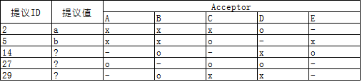 假设有A~E 5个acceptor,- 表示acceptor因宕机等原因缺席当次决议,x 表示acceptor不接受提议,o 表示接受提议;多数派acceptor接受提议后提议被确定,以上表格对应的决议过程如下: