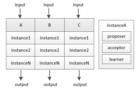 其实不断地进行“确定一个值”的过程、再为每个过程编上序号,就能得到具有全序关系(total order)的系列值,进而能应用在数据库副本存储等很多场景。我们把单次“确定一个值”的过程称为实例(instance),它由proposer/acceptor/learner组成,下图说明了A/B/C三机上的实例: