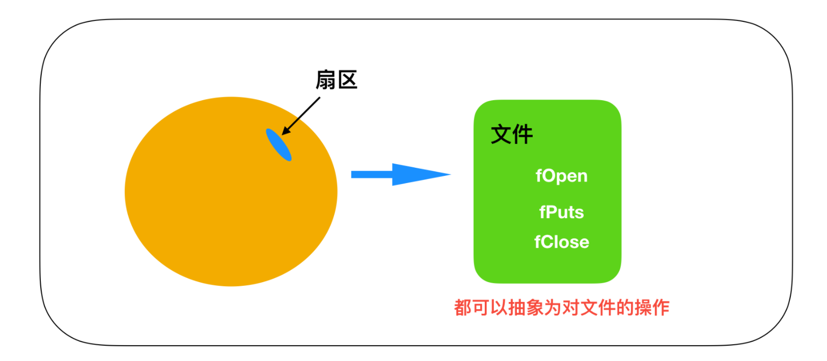 但是,在上面代码中,扇区压根就没有出现过传递给 fopen() 函数的参数,是文件名 MyFile.txt 和指定文件写入的 w。传递给 fputs() 的参数,是往文件中写入的字符串"你好" 和 fp,传递给 fclose() 的参数,也仅仅是 fp,也就是说磁盘通过打开文件这个操作,把磁盘抽象化了,打开文件这个操作就可以说是操作硬件的指令。