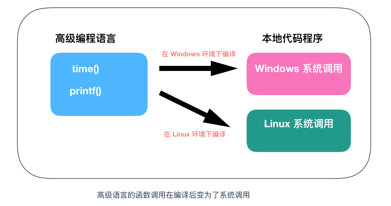 C 语言等高级编程语言并不依存于特定的操作系统,这是因为人们希望不管是Windows 操作系统还是 Linux 操作系统都能够使用相同的源代码。因此,高级编程语言的机制就是,使用独自的函数名,然后在编译的时候将其转换为系统调用的方式(也有可能是多个系统调用的组合)。也就是说,高级语言编写的应用在编译后,就转换成了利用系统调用的本地代码。