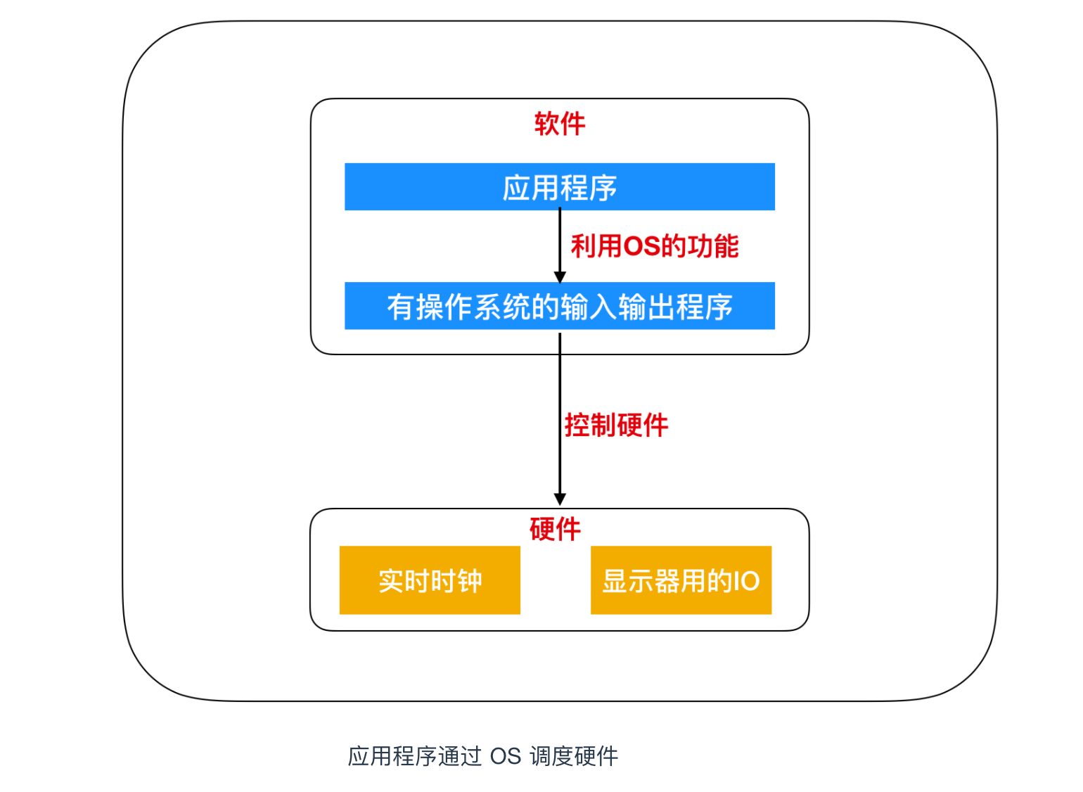 应用的可执行文件指的是,计算机的 CPU 可以直接解释并运行的本地代码,不过这些代码是无法直接控制硬件的,事实上,这些代码是通过操作系统来间接控制硬件的。变量中涉及到的内存分配情况,以及 time() 和 printf() 这些函数的运行结果,都不是面向硬件而是面向操作系统的。操作系统收到应用发出的指令后,首先会对该指令进行解释,然后会对 时钟IC 和显示器用的 I/O 进行控制。