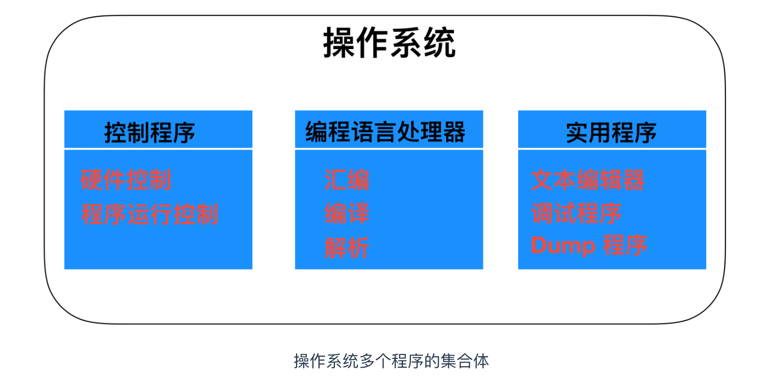 类似的想法可以共用,人们又发现有更多的应用程序可以追加到监控程序中,比如硬件控制程序,编程语言处理器(汇编、编译、解析)以及各种应用程序等,结果就形成了和现在差异不大的操作系统,也就是说,其实操作系统是多个程序的集合体。