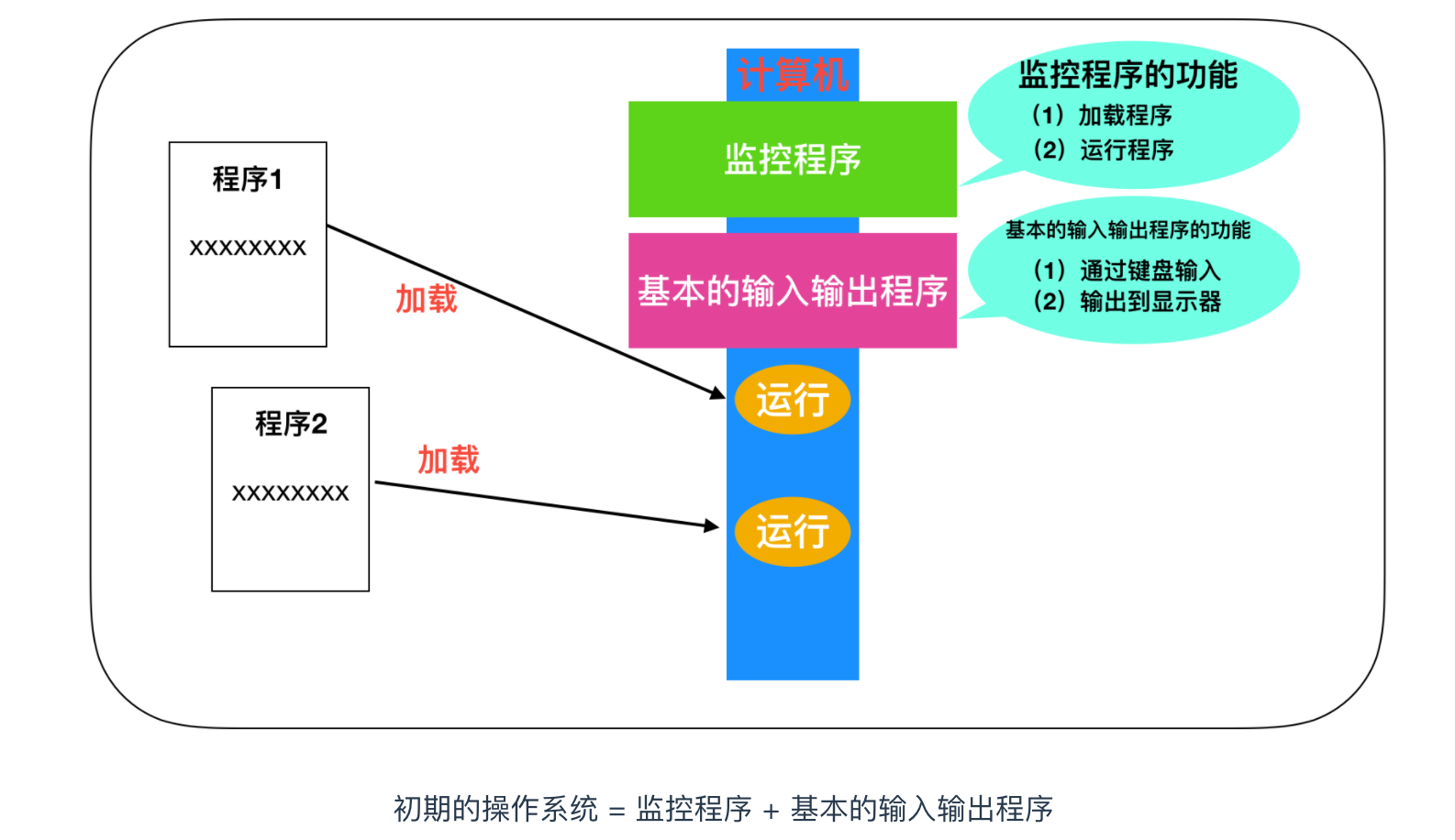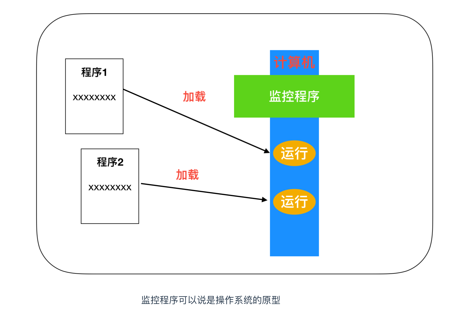 在计算机尚不存在操作系统的年代,完全没有任何程序,人们通过各种按钮来控制计算机,这一过程非常麻烦。于是,有人开发出了仅具有加载和运行功能的监控程序,这就是操作系统的原型。通过事先启动监控程序,程序员可以根据需要将各种程序加载到内存中运行。虽然仍旧比较麻烦,但比起在没有任何程序的状态下进行开发,工作量得到了很大的缓解。