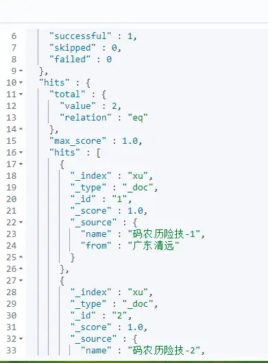 数据列表中有一个"_score"字段是用来排序的,"_score"数值越大,代表越排在前面,原理就是根据我前几篇文章就提到过的TF-IDF打分算法来实现的,现在我们在查询的时候什么排序规则都没有指定,所以"_score"值取默认值1。